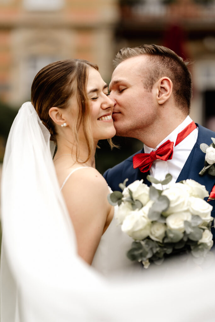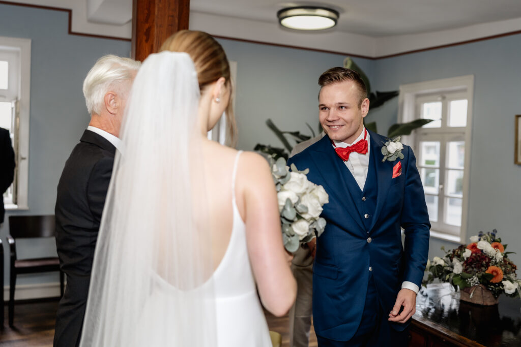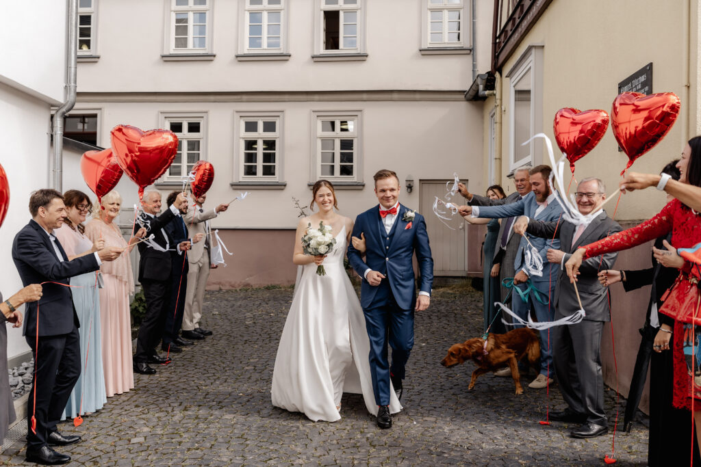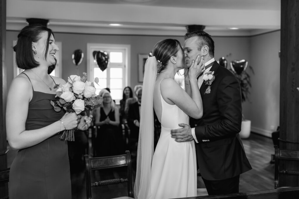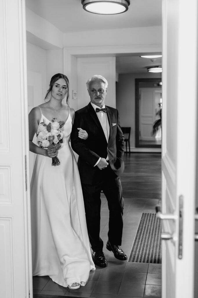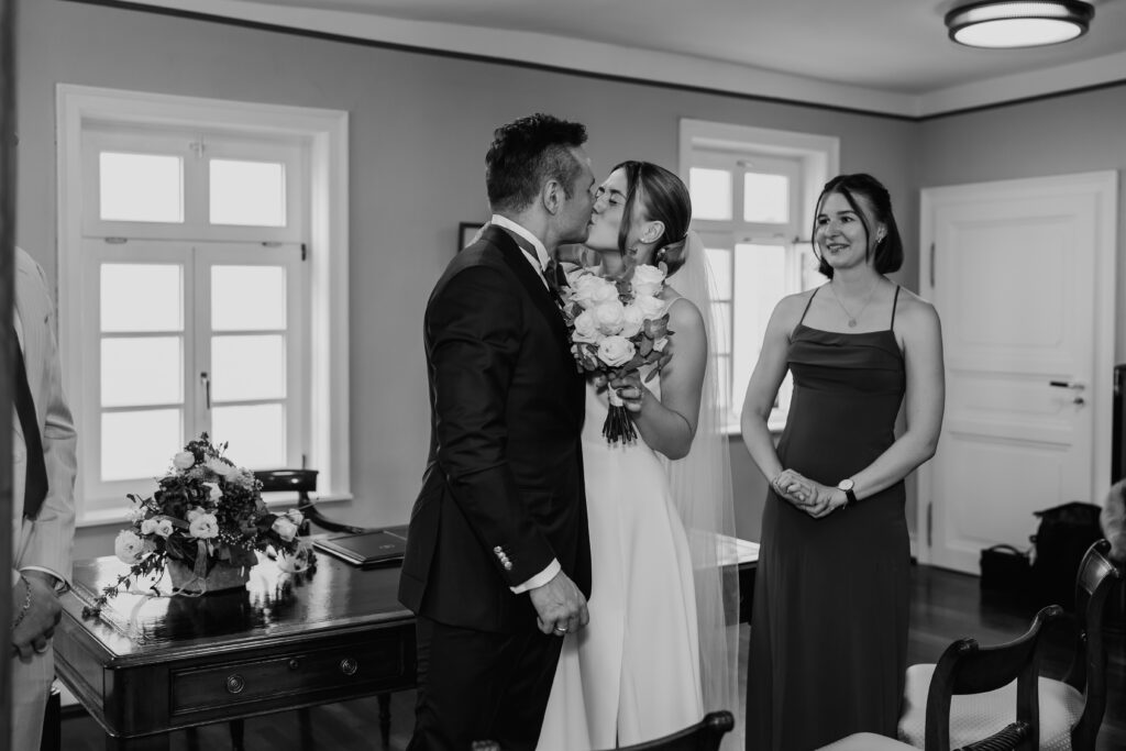 The photographic coverage began with the civil wedding ceremony in Bad Homburg. In an intimate and personal atmosphere, the couple exchanged vows surrounded by their closest loved ones. A very special moment: their dog was allowed to carry the rings and became a heartfelt part of the ceremony.