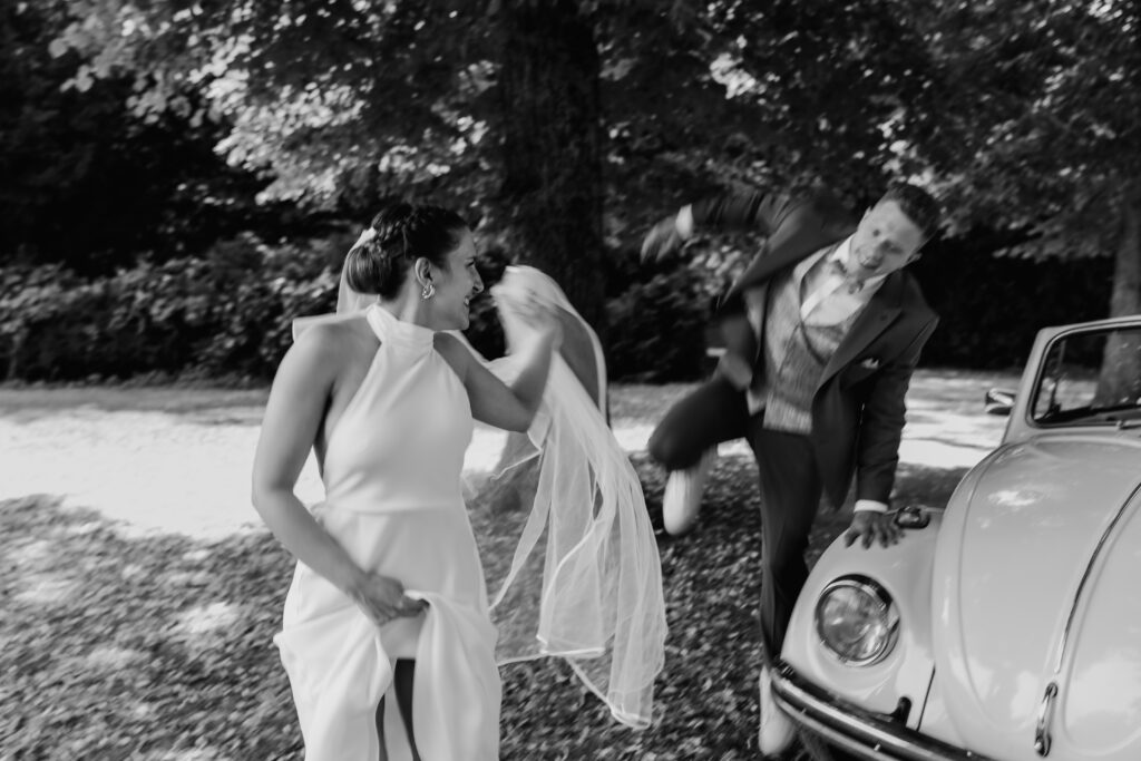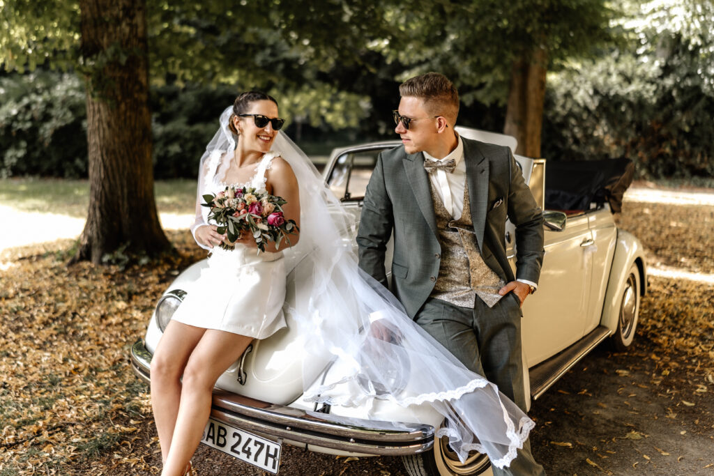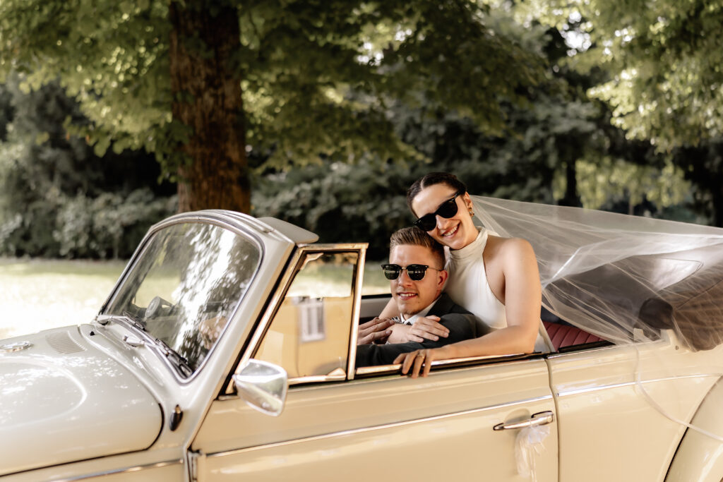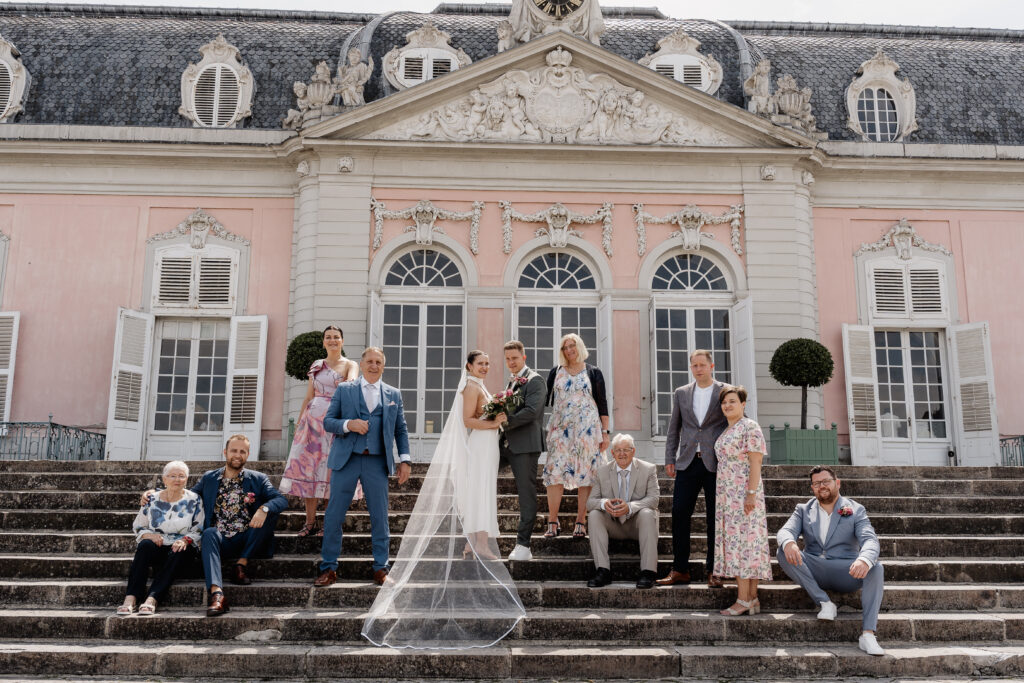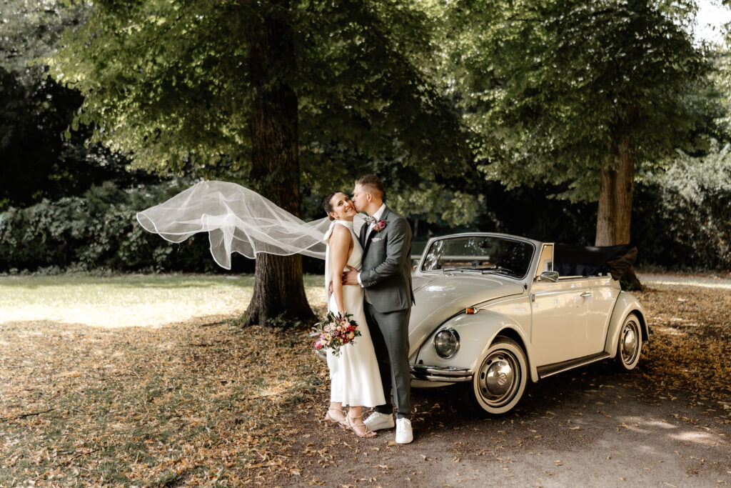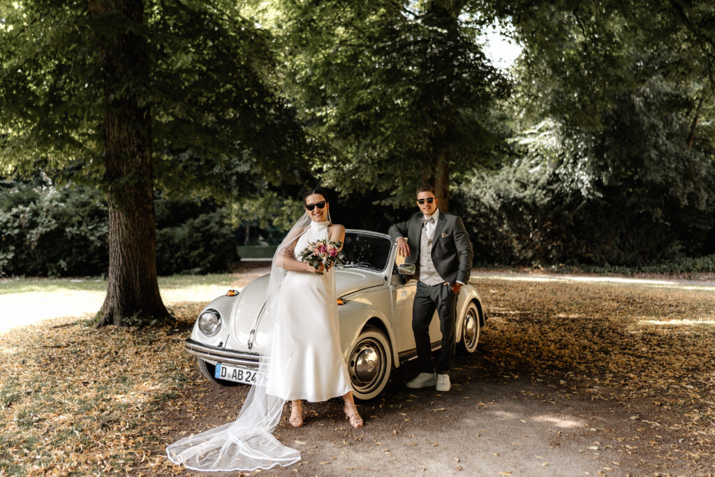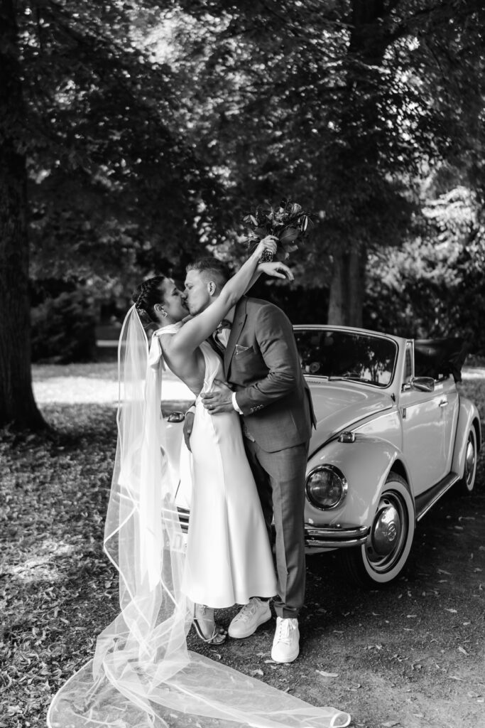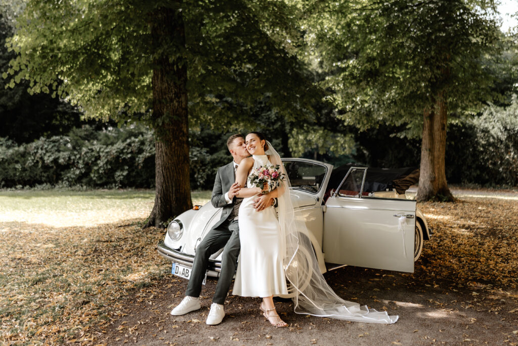 Following the ceremony, we took advantage of the stunning backdrop of Benrath Palace for the couple’s photoshoot and the family group portraits. We were accompanied by a beautifully maintained Volkswagen Beetle, which truly added something special to the shoot.