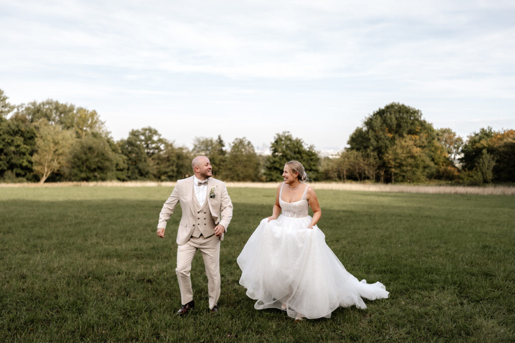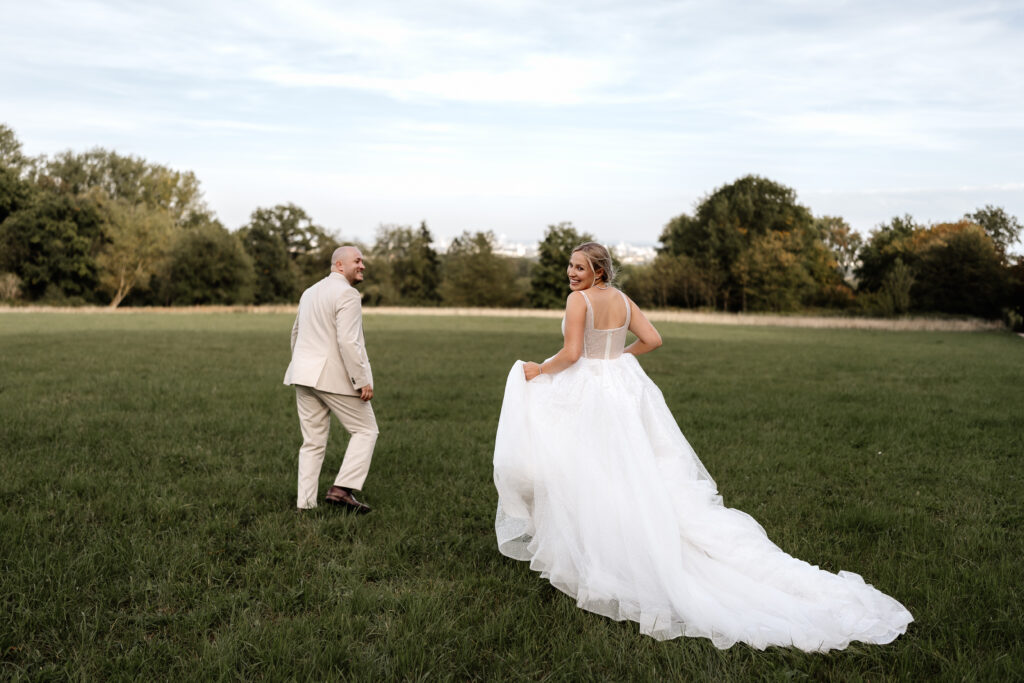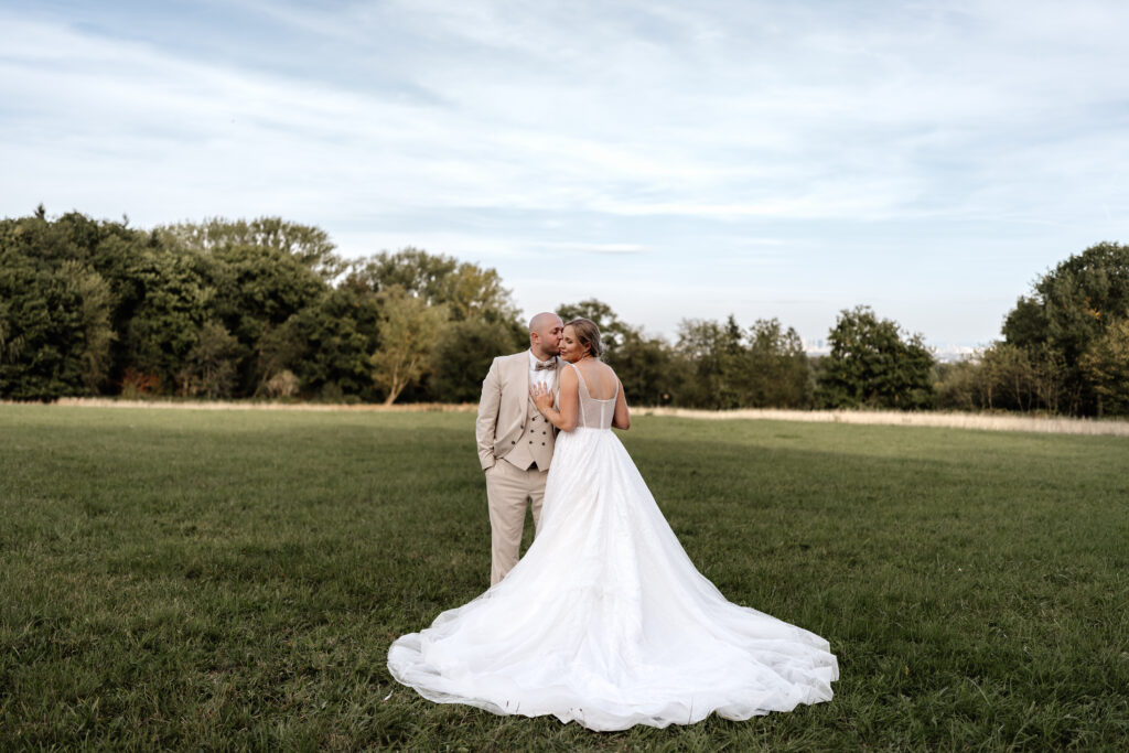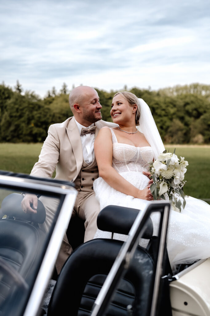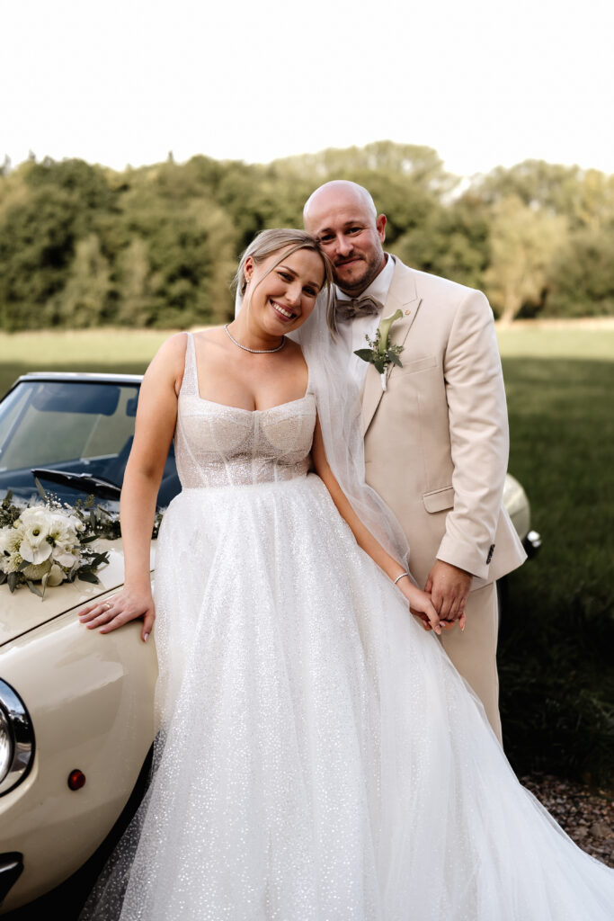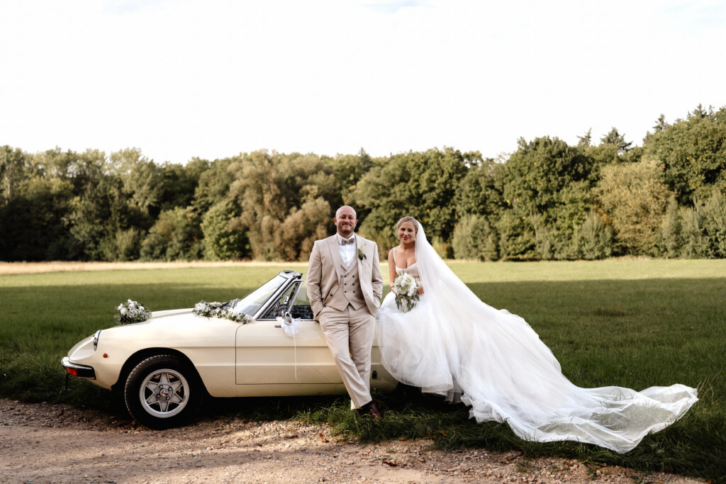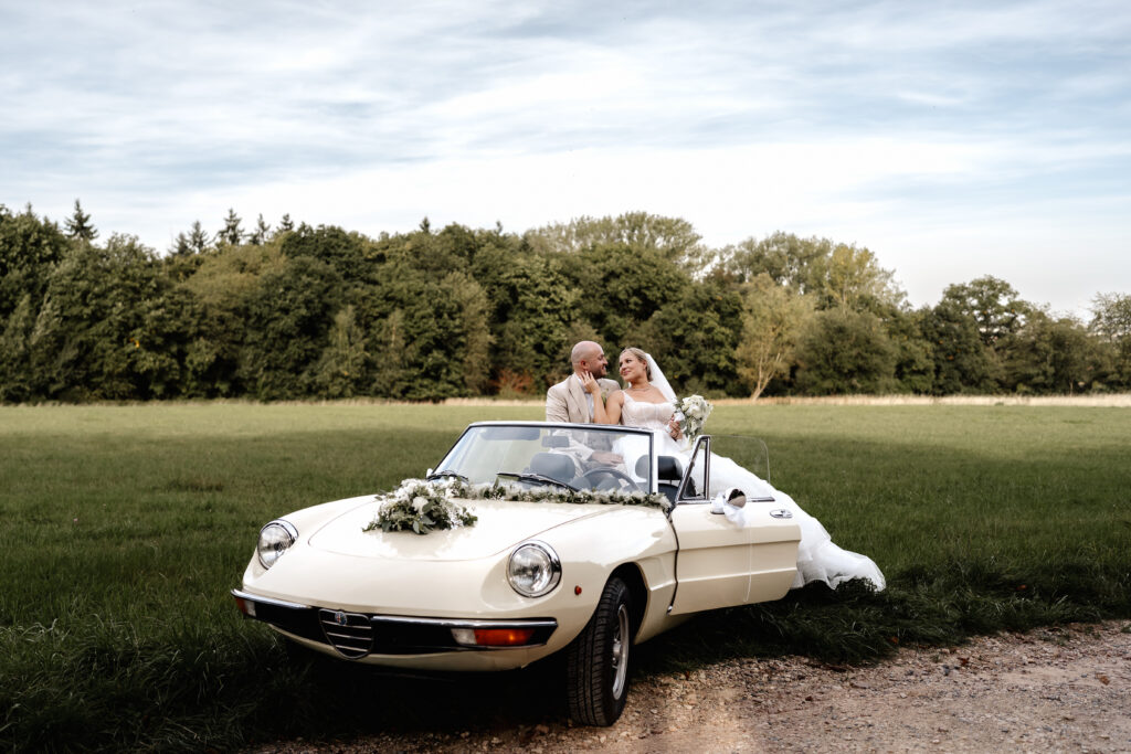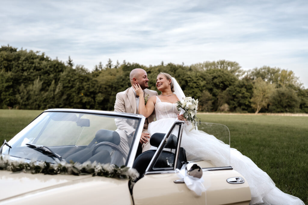 After the ceremony and a champagne reception on the registry office’s rooftop terrace, we headed to a nearby field for the couple’s photoshoot. The open landscape and the elegant wedding car gave the images a beautifully timeless feel.